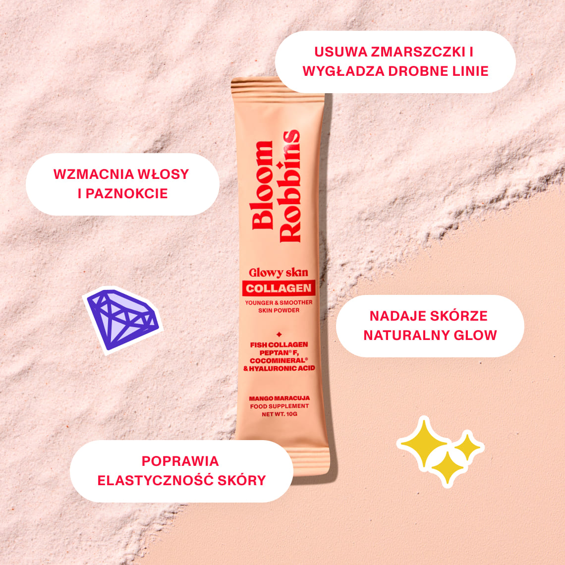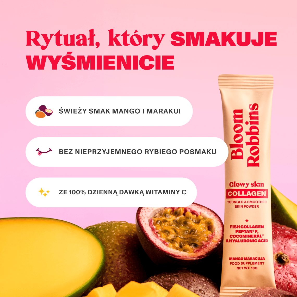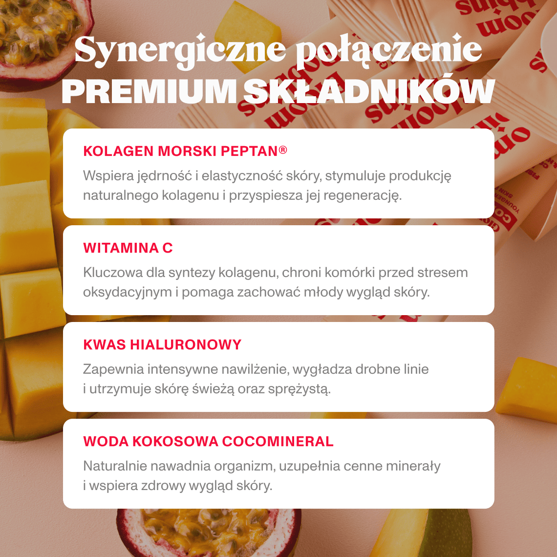 Peptydy kolagenu rybiego Peptan®, regulator kwasowości (kwas cytrynowy), inulina, sproszkowana woda kokosowa CocoMineral®, aromat, hialuronian sodu, witamina C (kwas L-askorbinowy), koncentrat buraka, substancja słodząca (sukraloza).