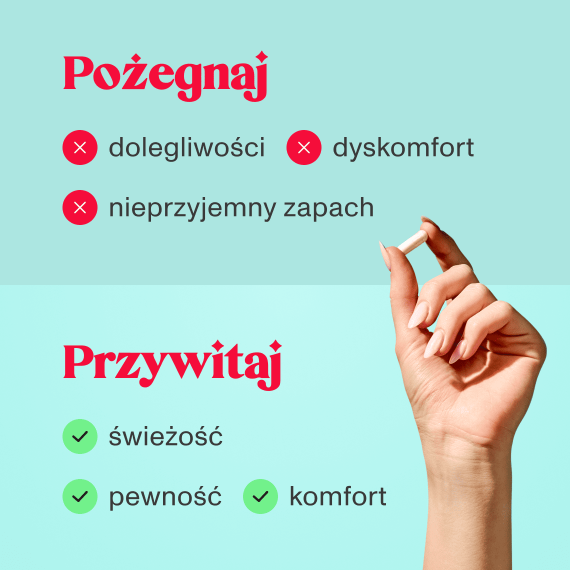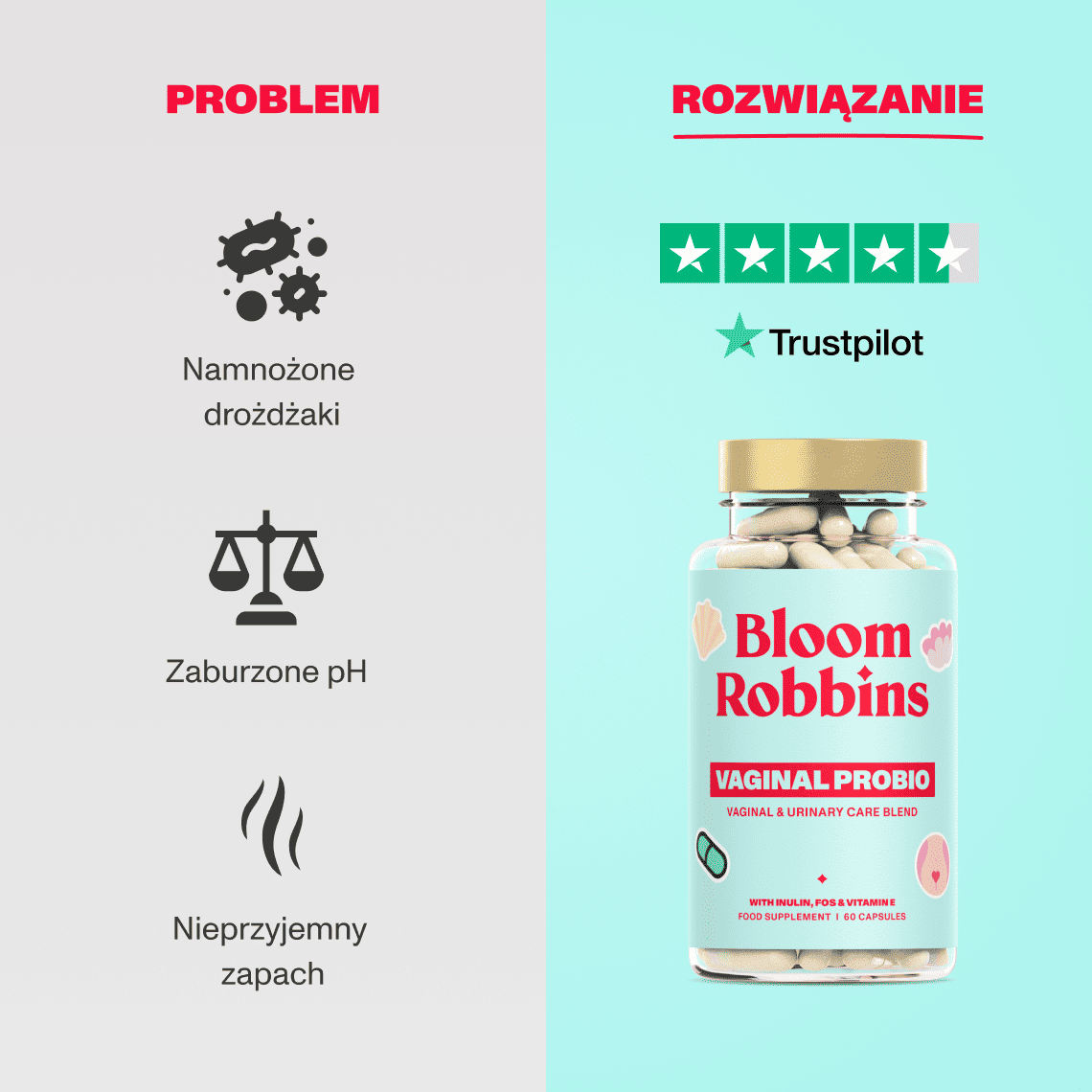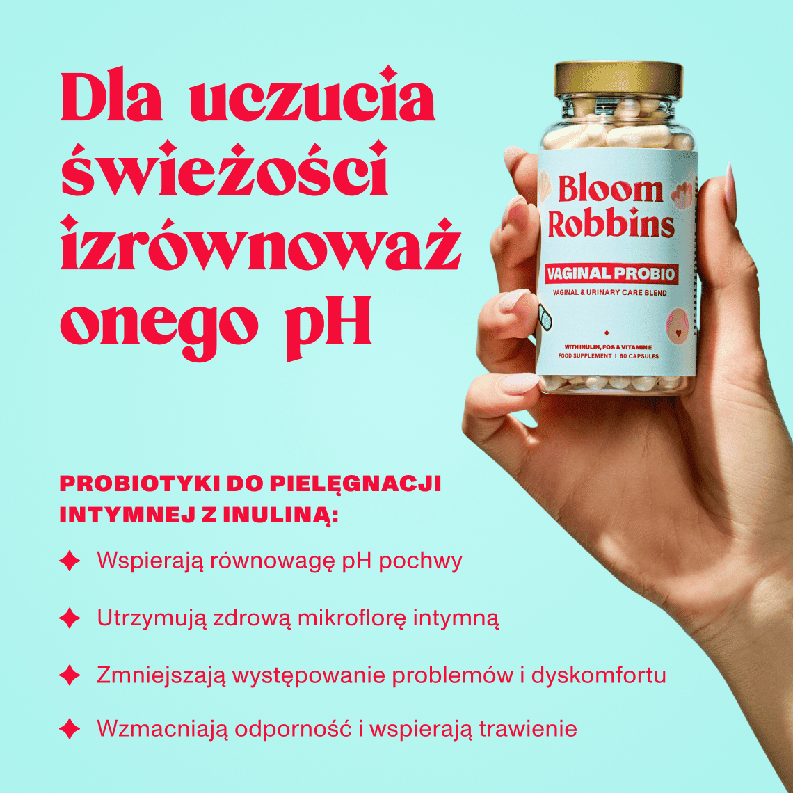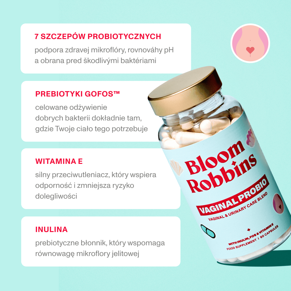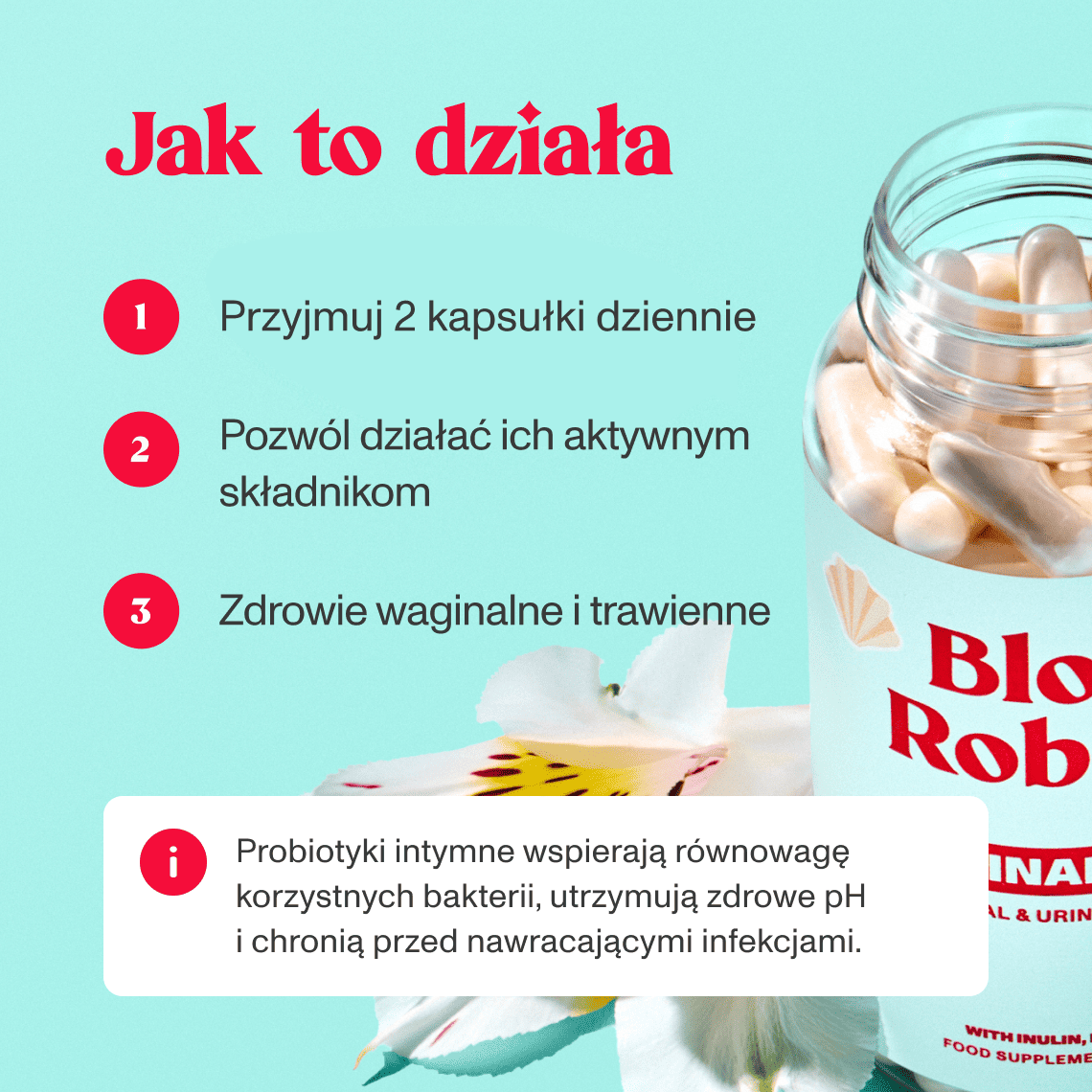 Probiotyki wiążą się z komórkami błony śluzowej pochwy i wytwarzają kwas mlekowy, który pomaga utrzymać naturalnie niskie pH. Tworzą tym samym środowisko nieprzyjazne dla szkodliwych bakterii i drożdżaków. Prebiotyki stanowią pożywkę dla dobrych bakterii, a witamina E chroni komórki przed stresem oksydacyjnym.