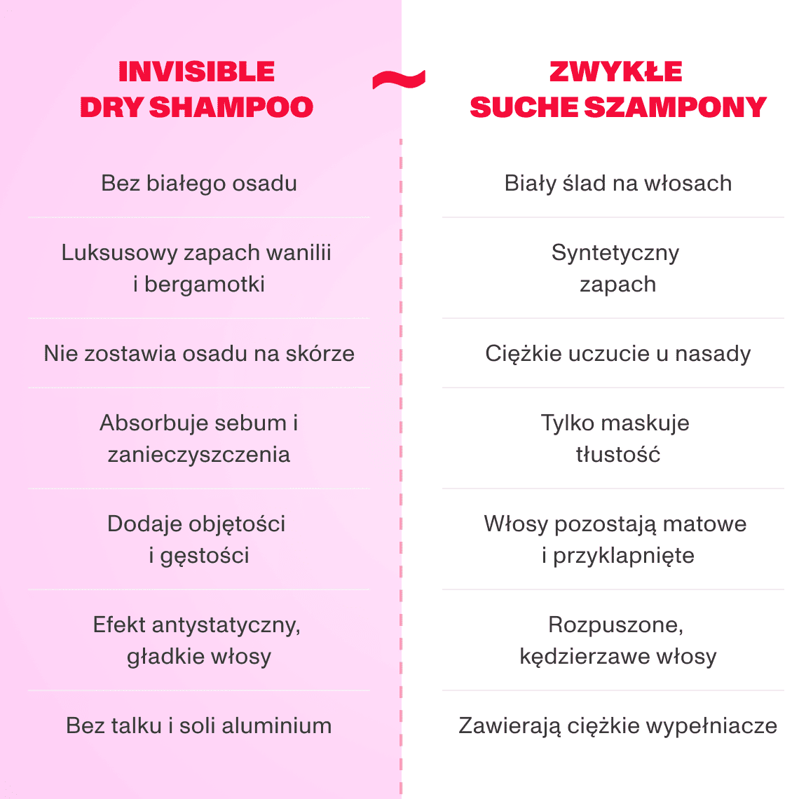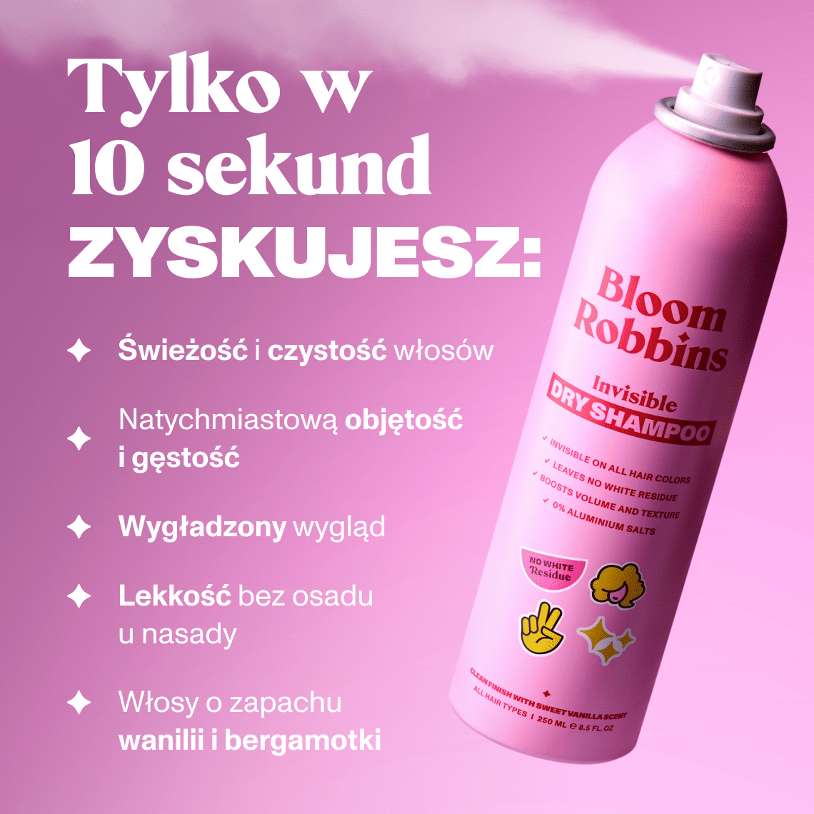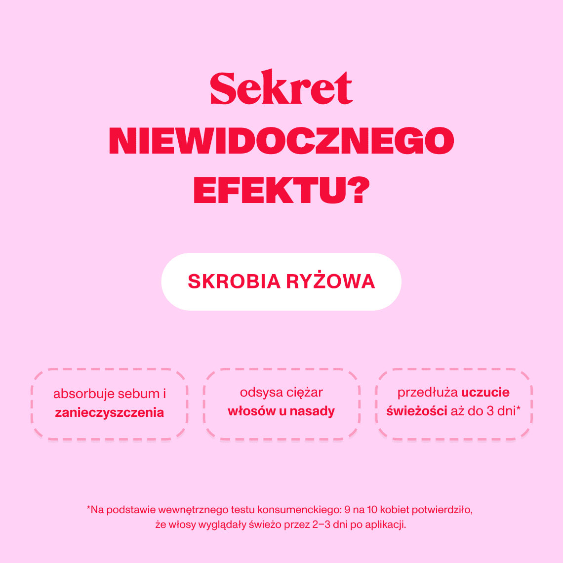 Invisible Dry Shampoo to Twój nowy hair hack na czyste i świeże włosy z objętością w zaledwie 10 sekund. Zaawansowana formuła z ryżową skrobią natychmiast pochłania sebum i zanieczyszczenia. Nie pozostawia białego osadu i jest niewidoczny na każdym kolorze włosów. A do tego luksusowy zapach słodkiej wanilii z bergamotką.