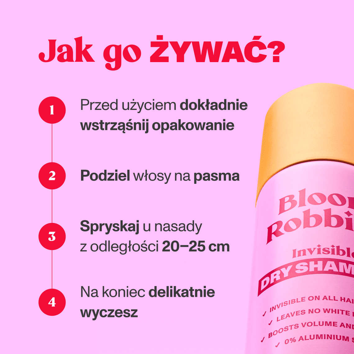 Podziel włosy na równomierne pasma. Przed użyciem dobrze wstrząśnij opakowaniem. Trzymaj butelkę 20–25 cm od głowy i rozpyl przy nasadzie włosów tam, gdzie są najbardziej przetłuszczone. Dokładnie wyczesz.