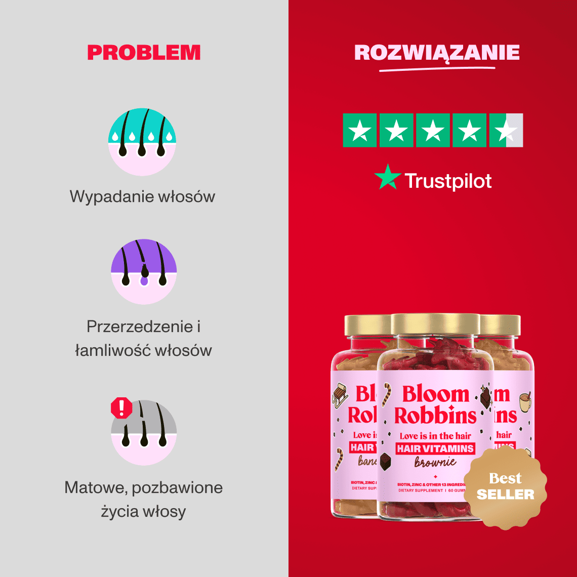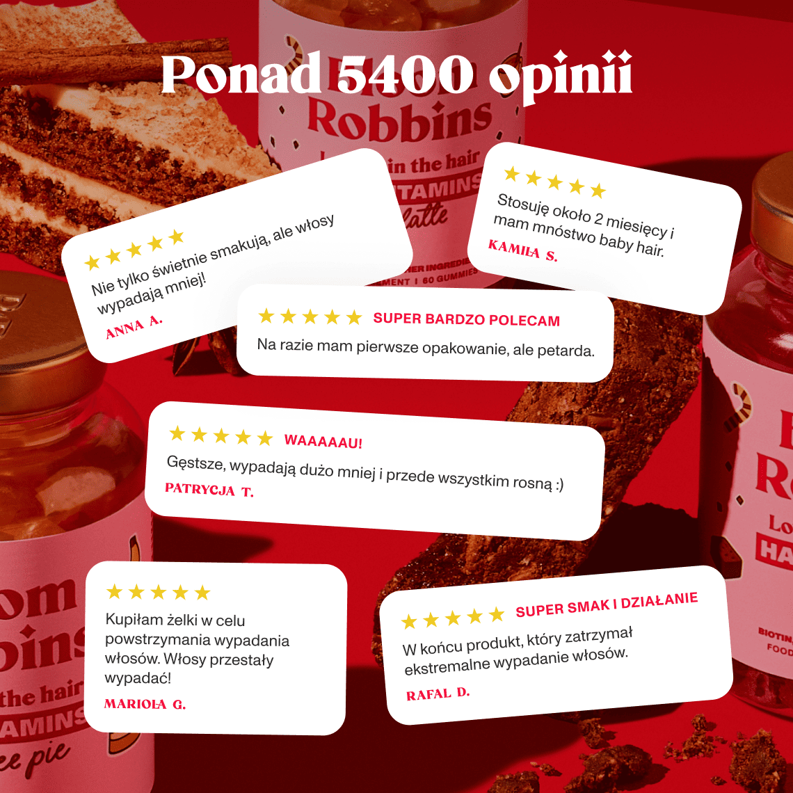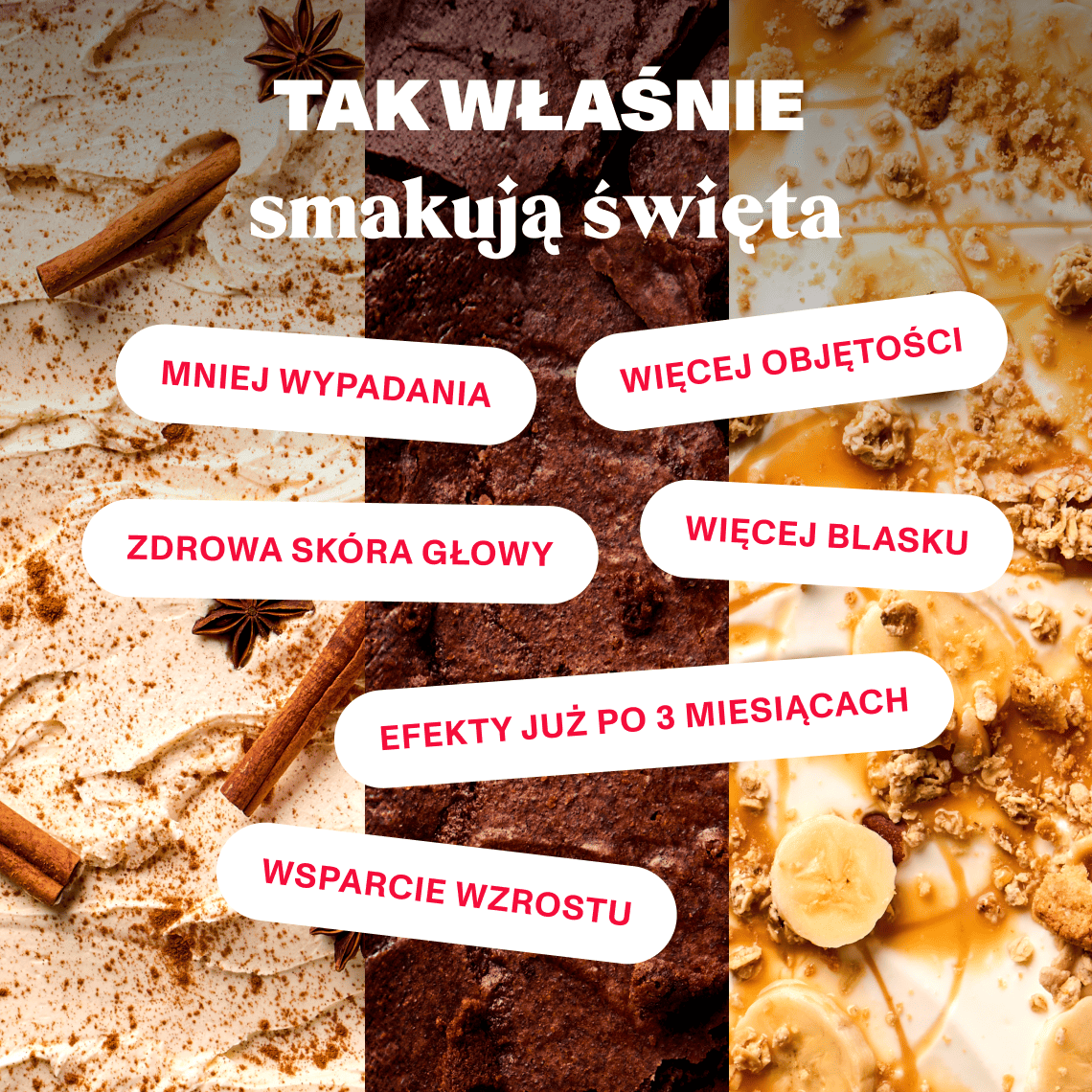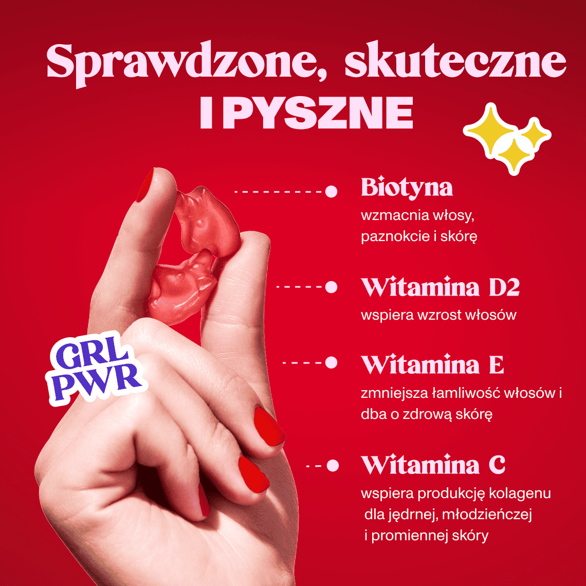 Każde opakowanie skrywa pyszne żelki pełne biotyny, cynku, selenu oraz innych 12 substancji aktywnych, które wspierają wzrost włosów, ograniczają ich wypadanie i nadają im zdrowy blask oraz wytrzymałość.